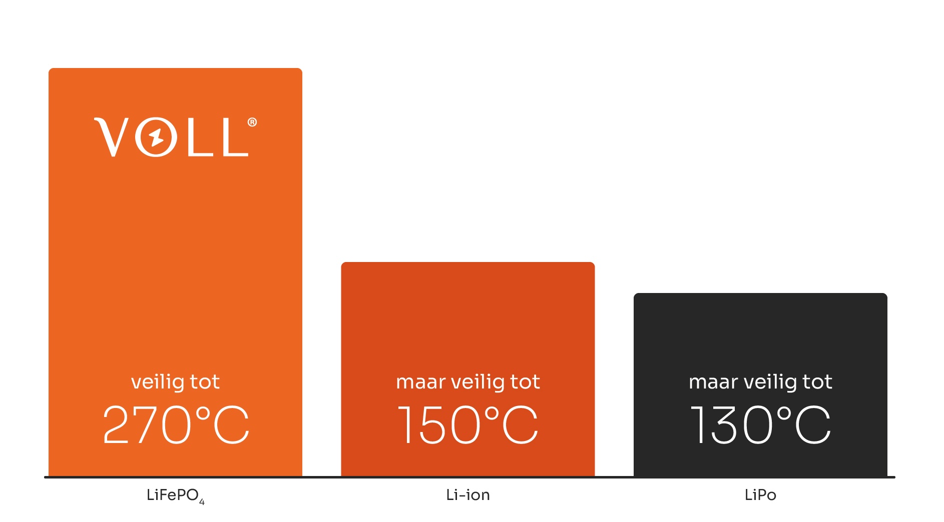 VOLL® kiest bewust voor LiFePO4. LFP is namelijk thermisch veel stabieler en kan daardoor veel hogere temperaturen verdragen. In de afbeelding zie je het verschil in veilige temperatuurrange: