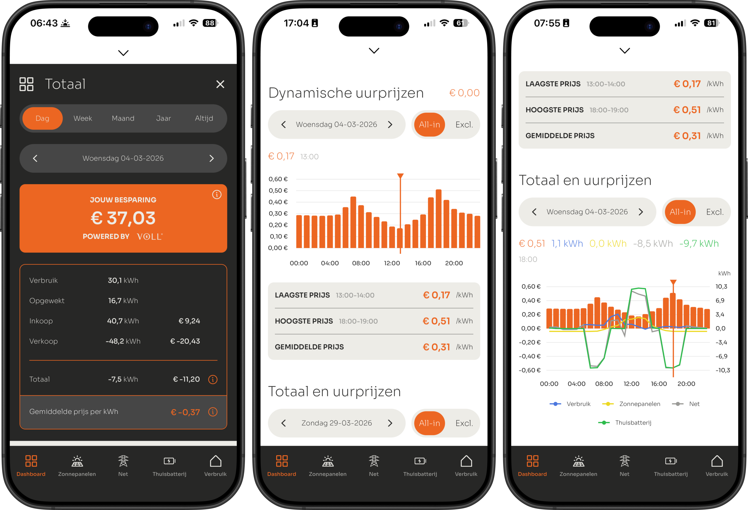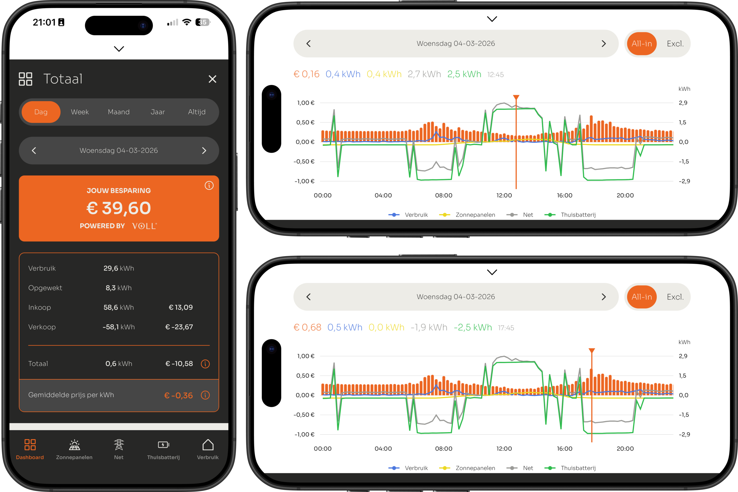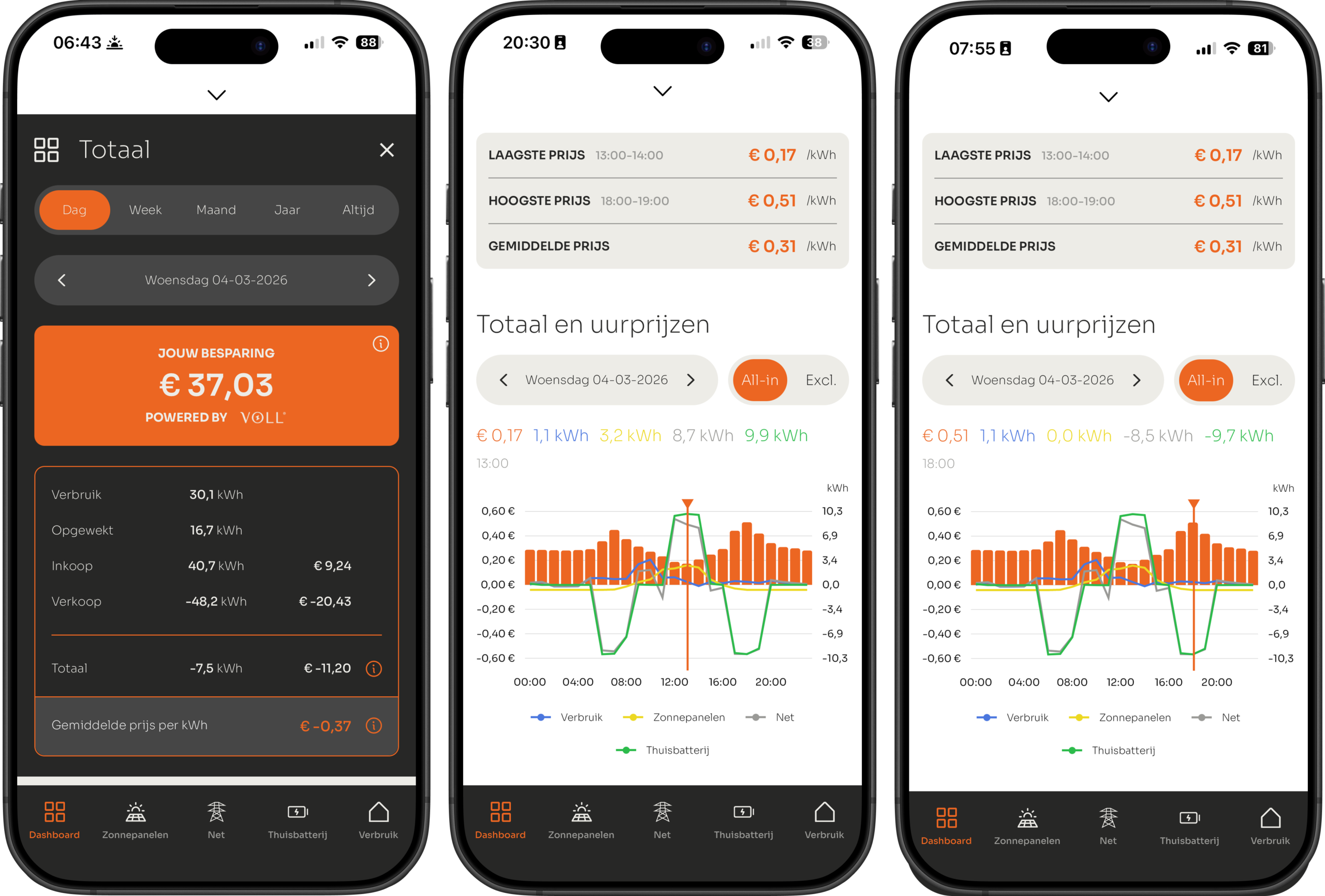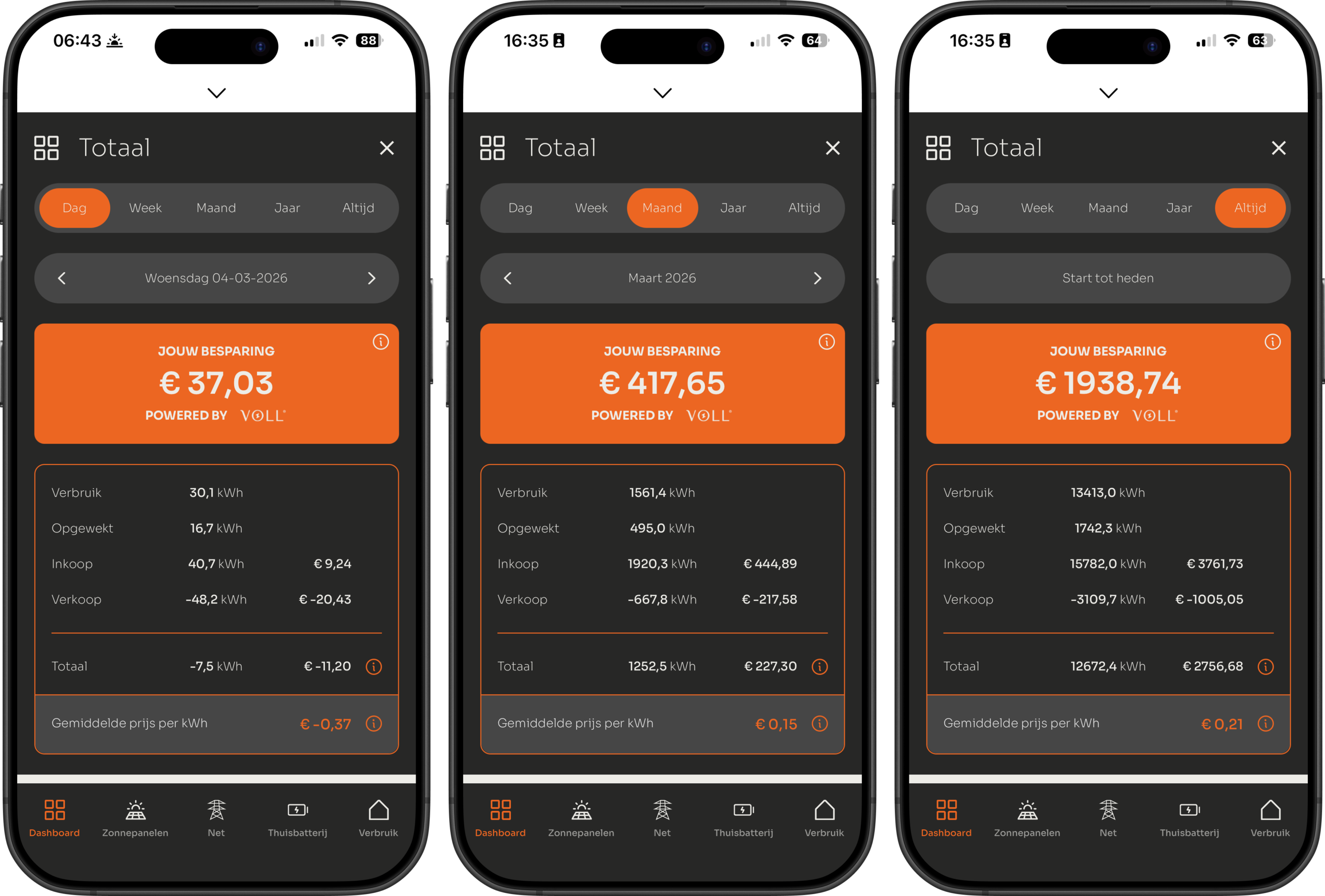 Op de homepage van de VOLL® APP kun je omlaag swipen, hierdoor kom je op het dashboard uit. Hier vind je alle besparingen, kosten, de dynamische uur- of kwartierprijzen, én het totaal overzicht van alle energiestromen in jouw huishouden.