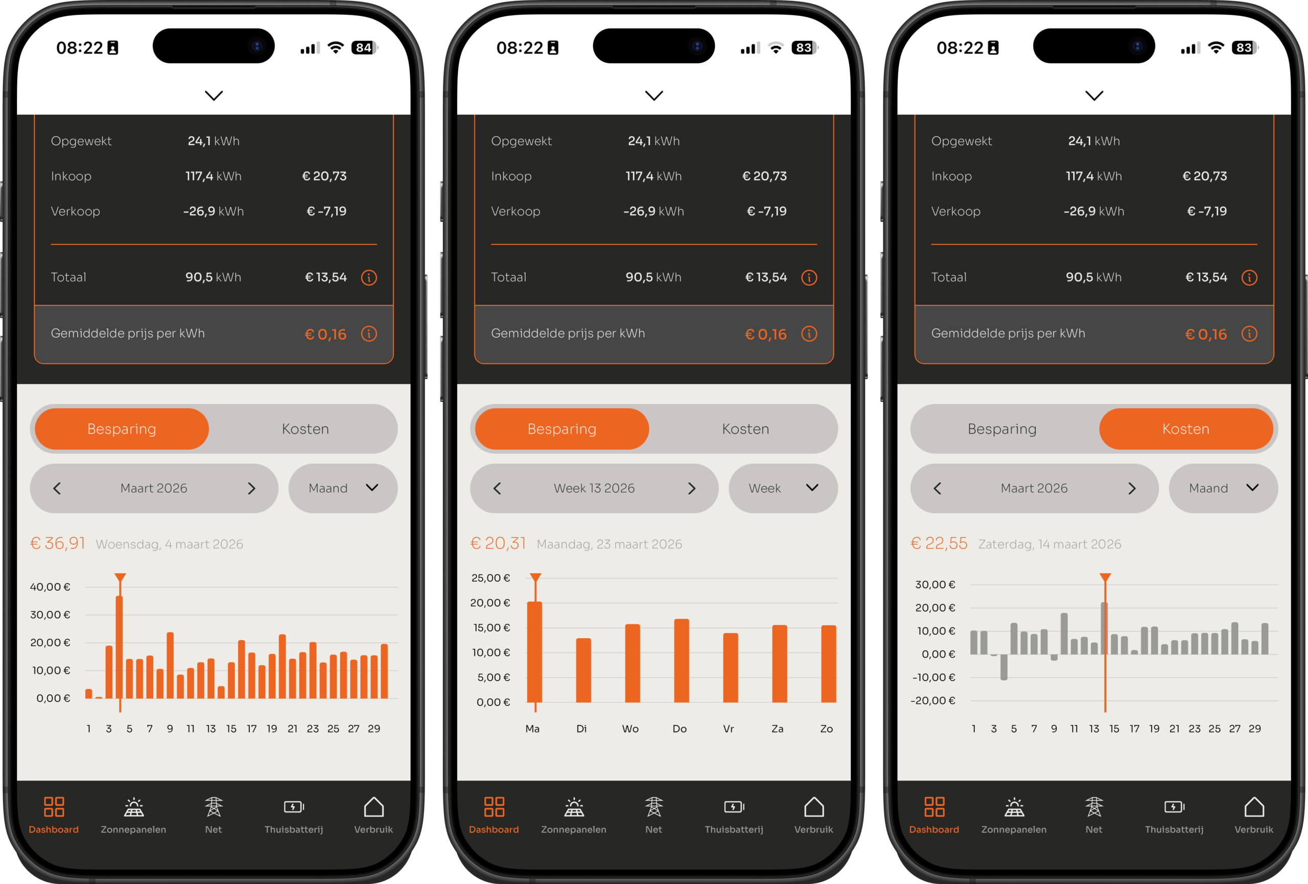 De totale besparing van de verschillende energiestromen in jouw huishouden, vind je terug in het dashboard. Het is een optelsom van de volgende besparingen:
