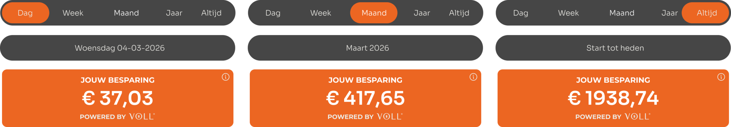 De besparing kan worden bekeken per dag, per week, per maand, per jaar, en vanaf het plaatsen van het systeem tot en met het heden.