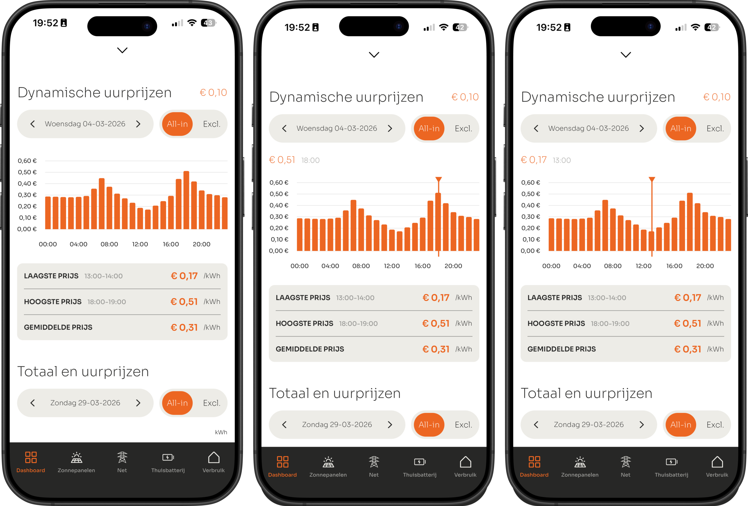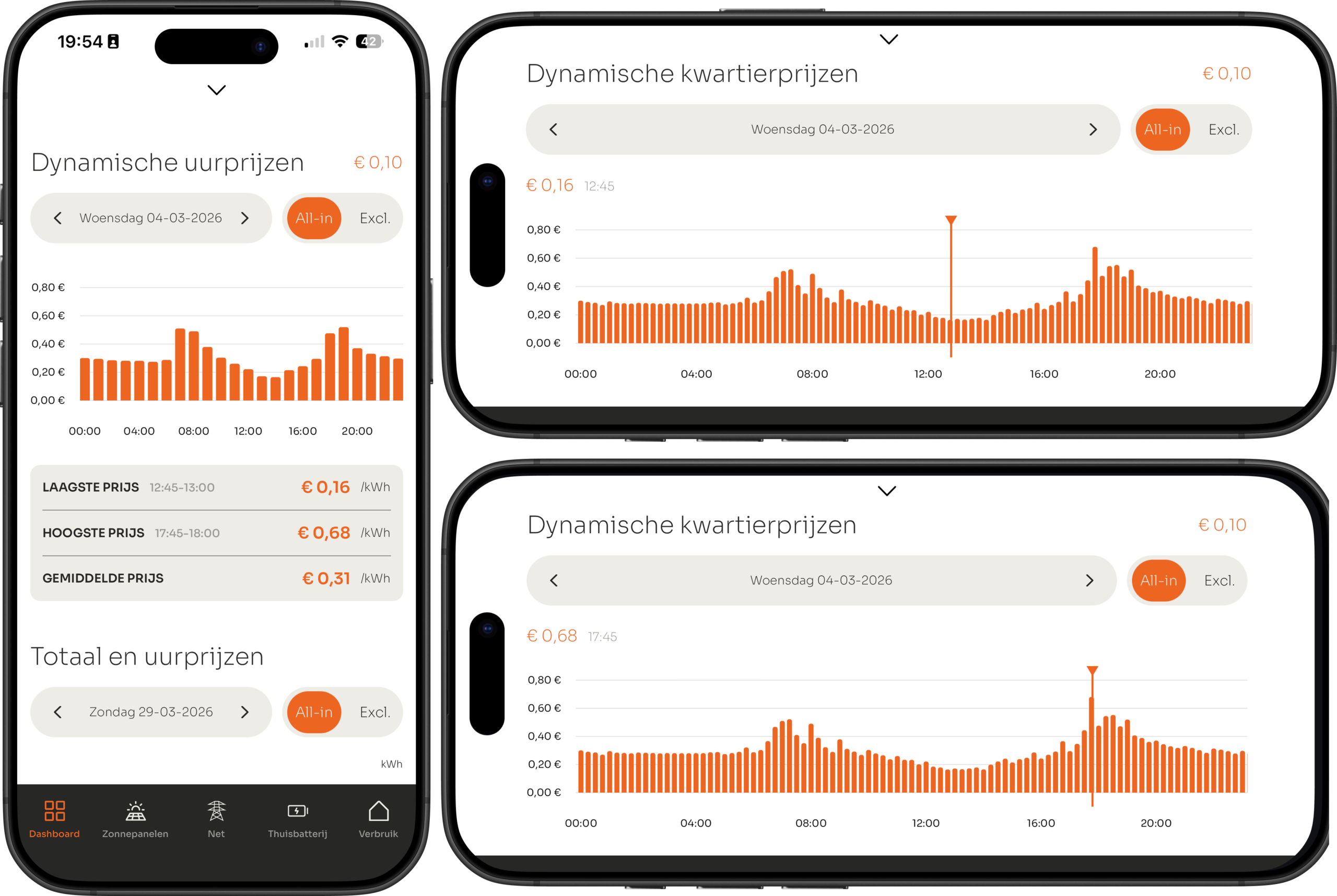 Op 04-03-2026 van 18:00 tot 19:00 is de kale marktprijs €0,030958. In de app zie je dit als afgeronde excl. prijs: € 0,31.