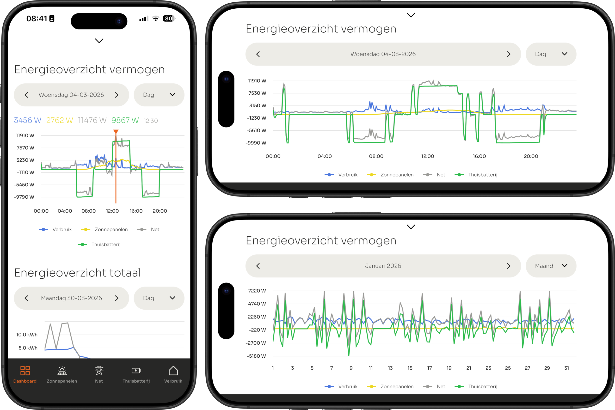 Je ziet precies hoeveel er in real time werd opgewekt, verbruikt, opgeladen, ontladen, ingekocht of verkocht. Je kunt dus goed de piekmomenten in jouw stroomverbruik achterhalen.