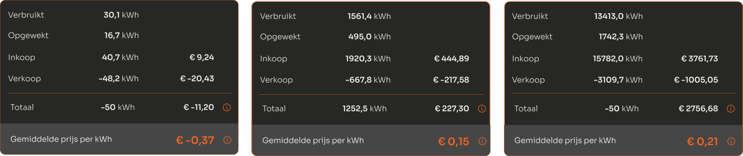 Gemiddelde prijs per kWh: De gemiddelde prijs per kWh die jij hebt betaald voor het verbruik in huis. We delen het aantal kWh voor het verbruik bovenaan, door de totale kosten die gemaakt zijn.