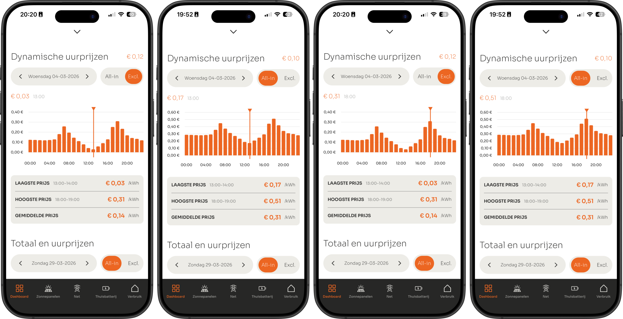 Op 04-03-2026 van 13:00 tot 14:00 is de kale marktprijs €0,0296. In de app zie je dit als afgeronde excl. prijs: € 0,03.