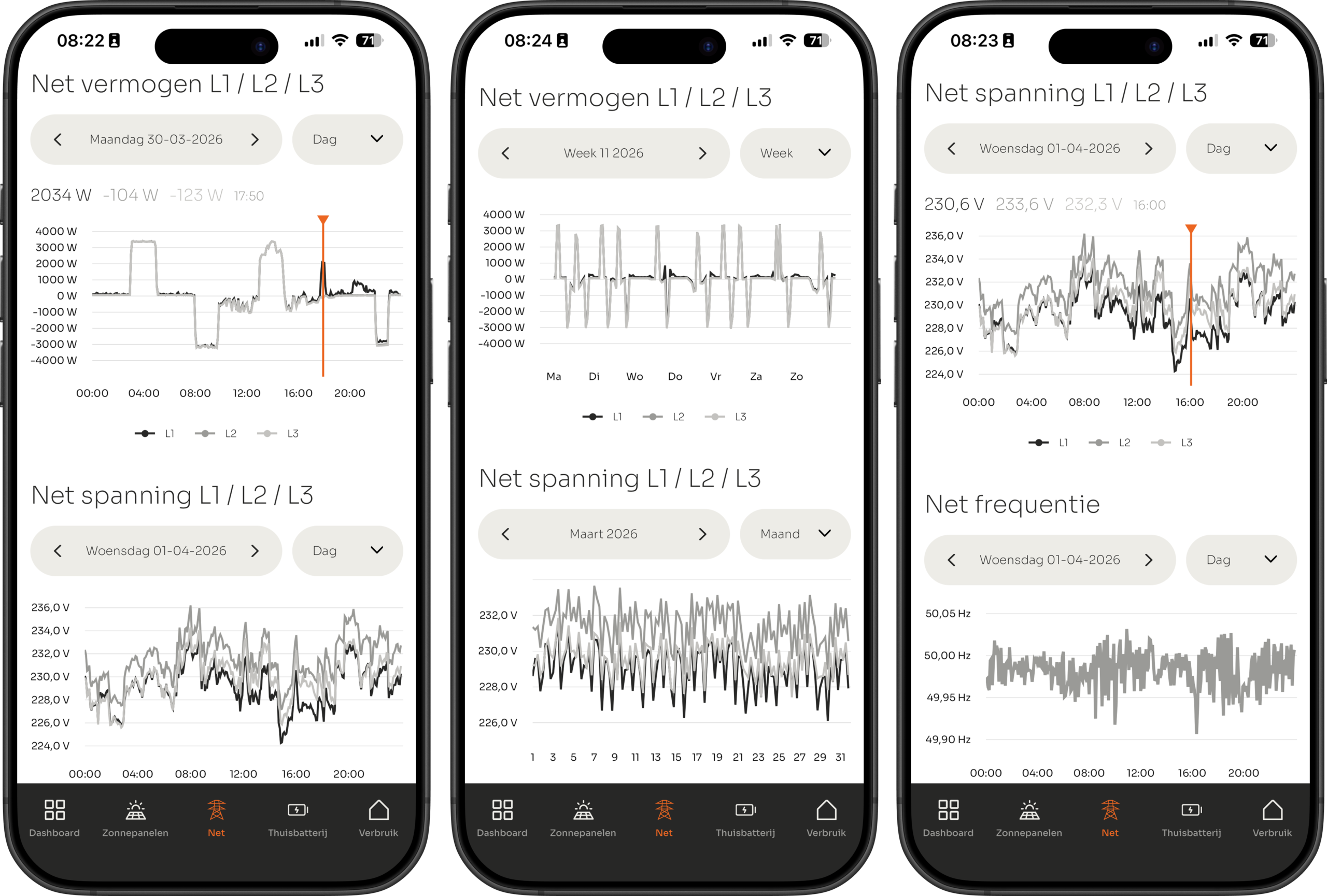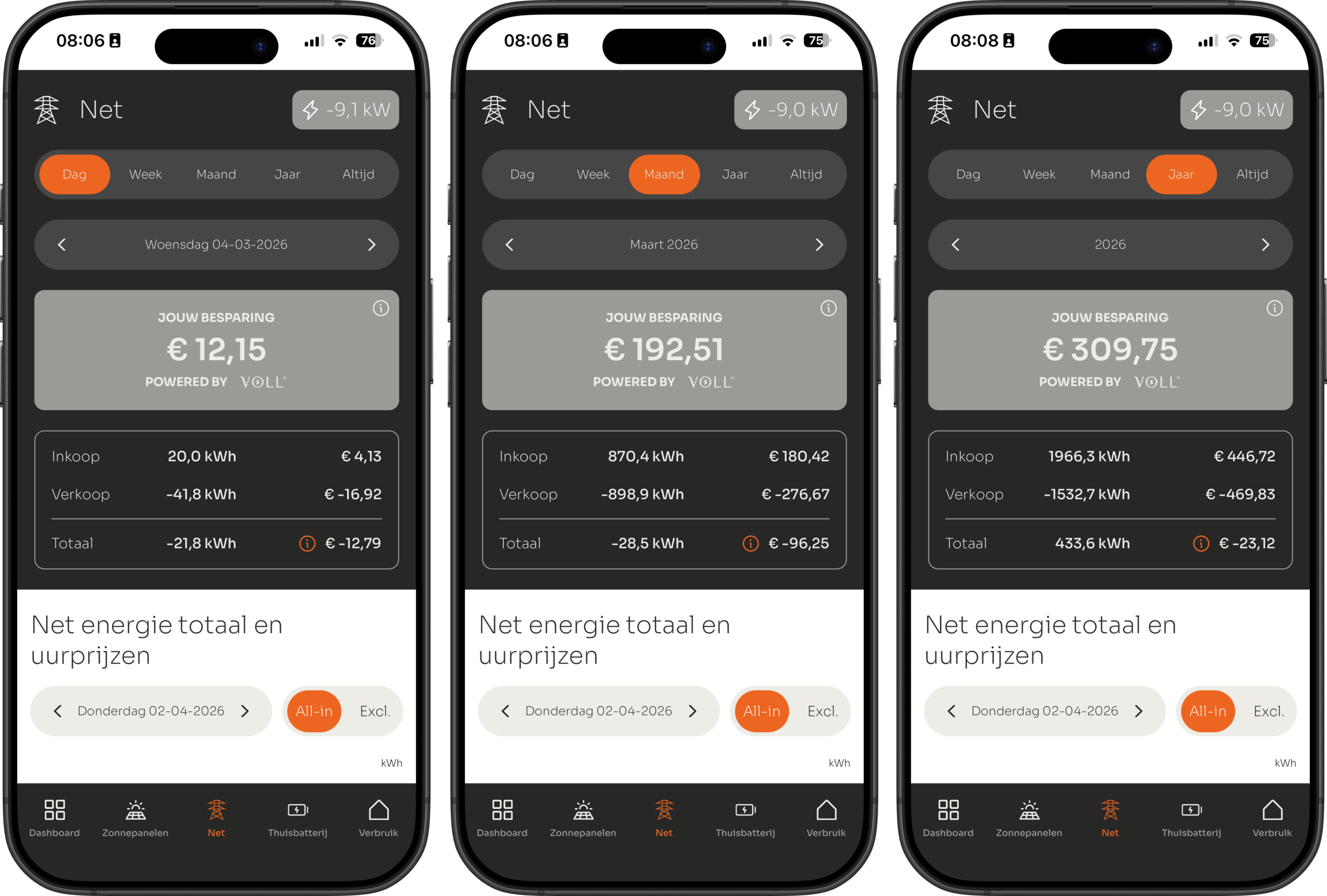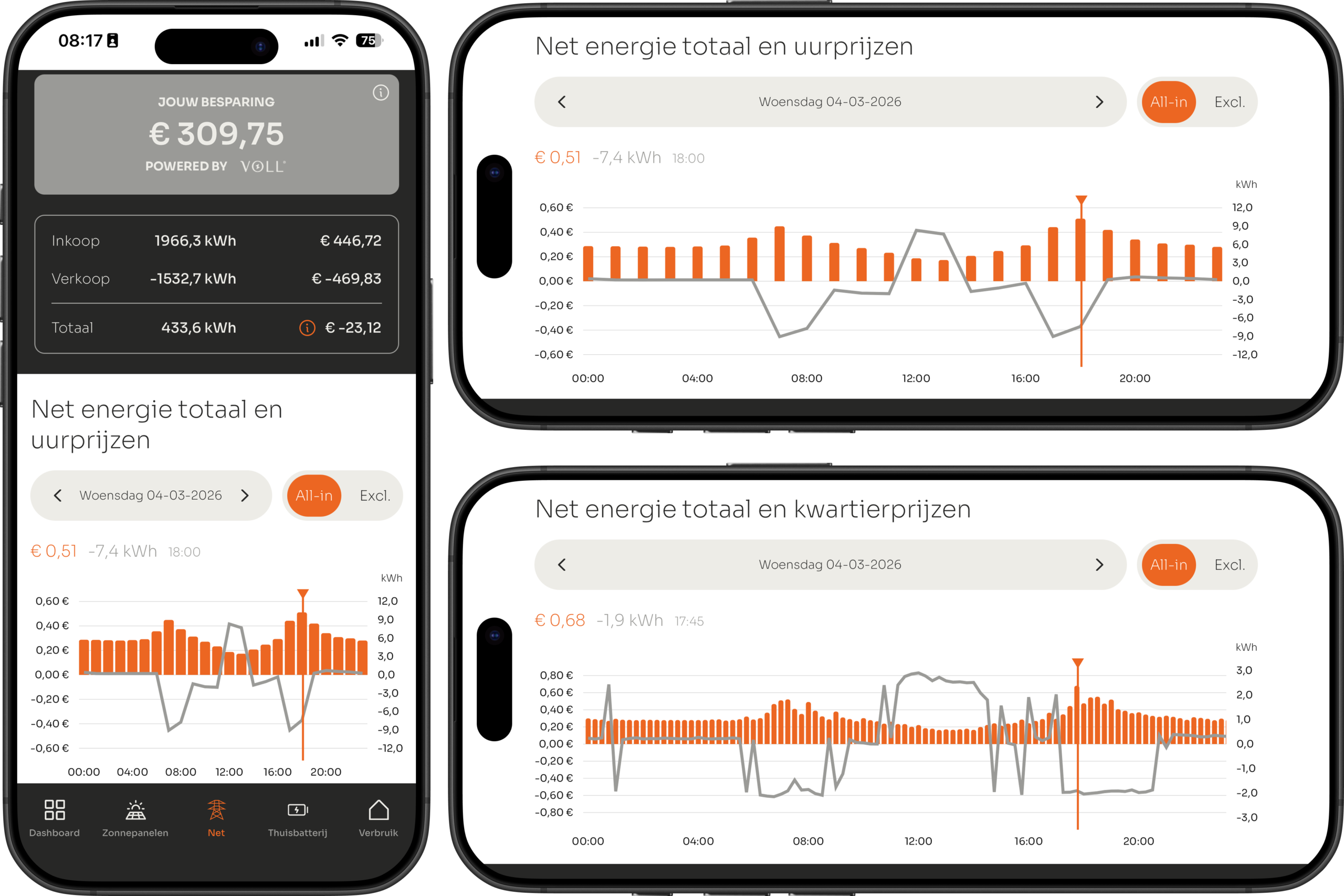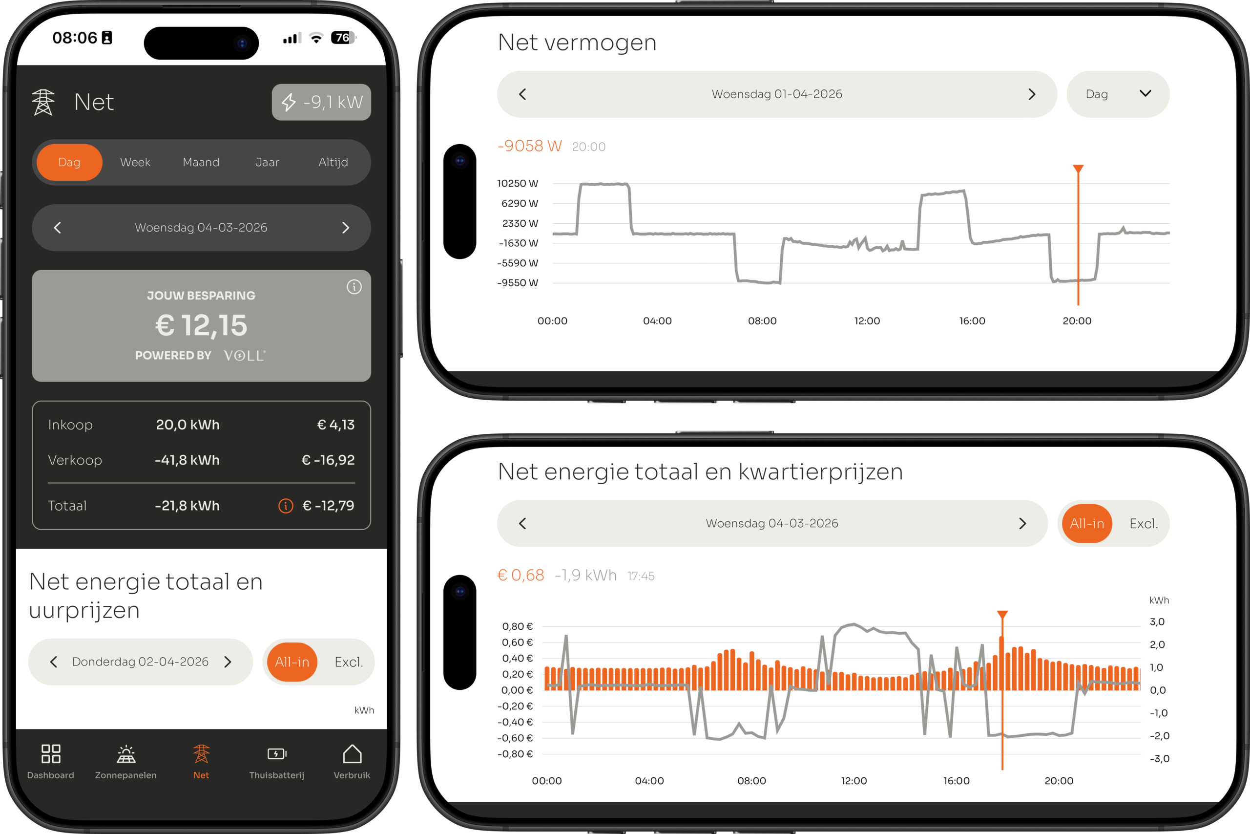 Het VOLL® systeem wordt standaard uitgevoerd met een eigen kWh-meter in jouw meterkast. Hierdoor kunnen we elke seconde nauwkeurig meten wat er gebeurt. Op deze pagina vind je daardoor alle gegevens over de actuele status van het net, zoals de spanning en het vermogen per fase, of zelfs de netfrequentie, maar ook de kosten van jouw energierekening én de besparing die behaald wordt door het toepassen van een dynamisch energiecontract in combinatie met slimme sturing.
