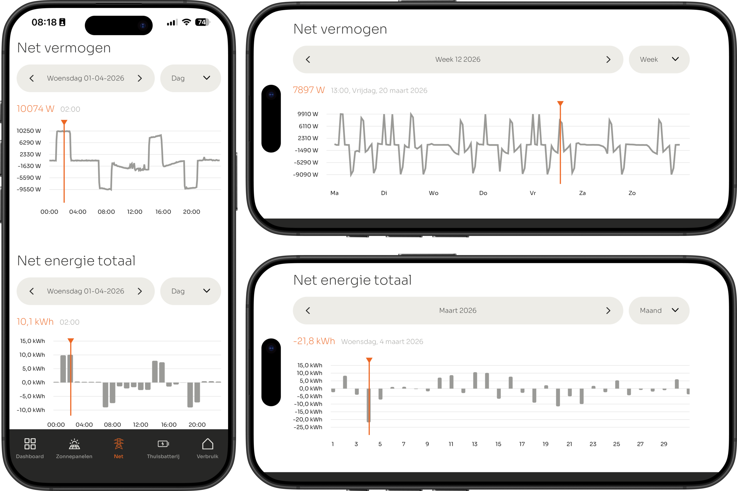De data van de verbinding tussen het stroomnet en jouw huishouden wordt weergegeven en samengevat in verschillende grafieken. Hieronder wordt elke grafiek apart toegelicht.