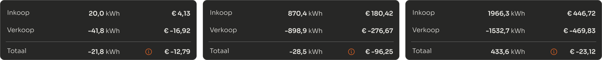 Totaal: De hoeveelheid energie en de bijbehorende kosten van het in- en verkopen van energie van en aan het net, worden bij elkaar opgeteld, om tot de totale kosten te komen. Dit is wat jij in de desbetreffende periode aan energiekosten hebt betaald.