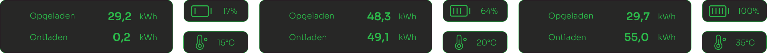 Energieoverzicht, SoC (%) en temperatuur