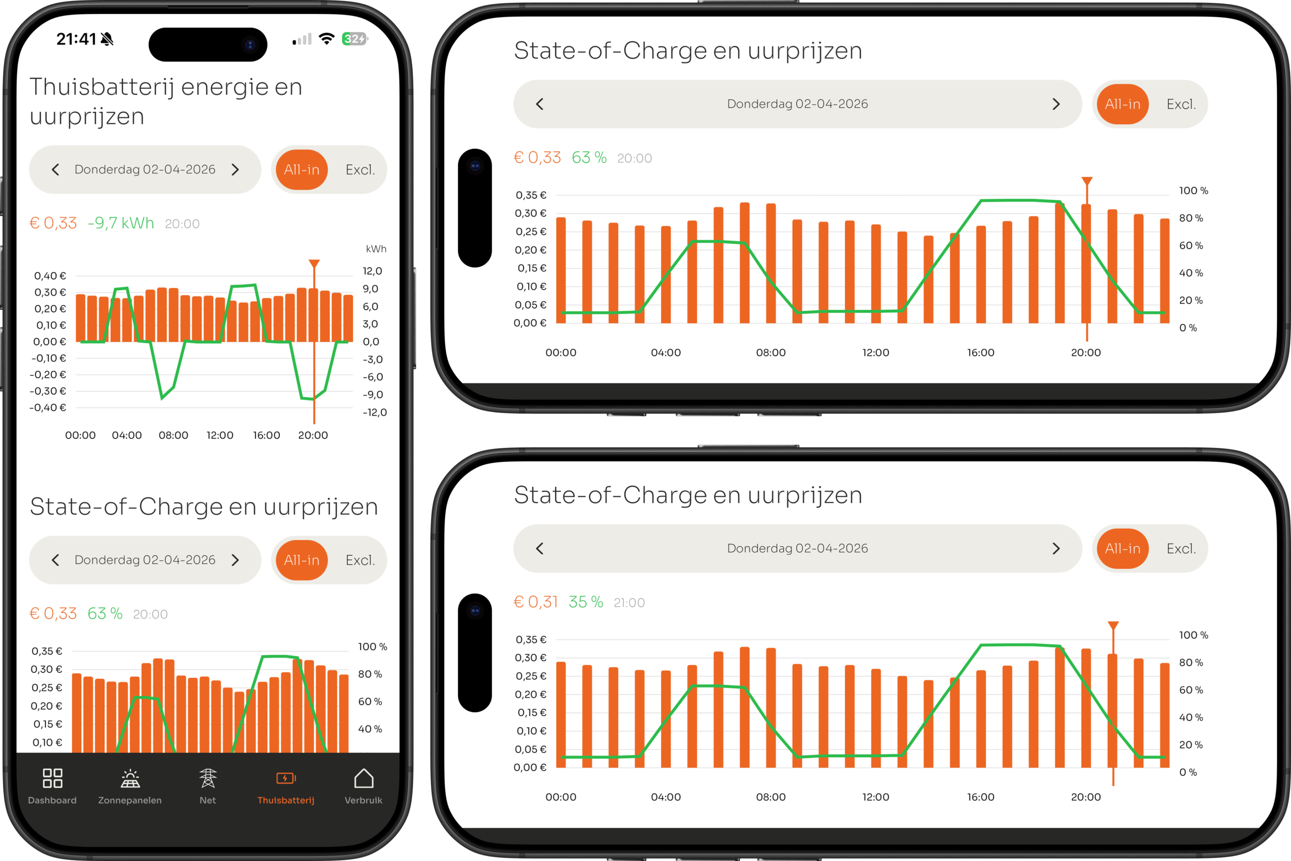 De data van jouw thuisbatterij wordt weergegeven en samengevat in verschillende grafieken. Hieronder wordt elke grafiek apart toegelicht.