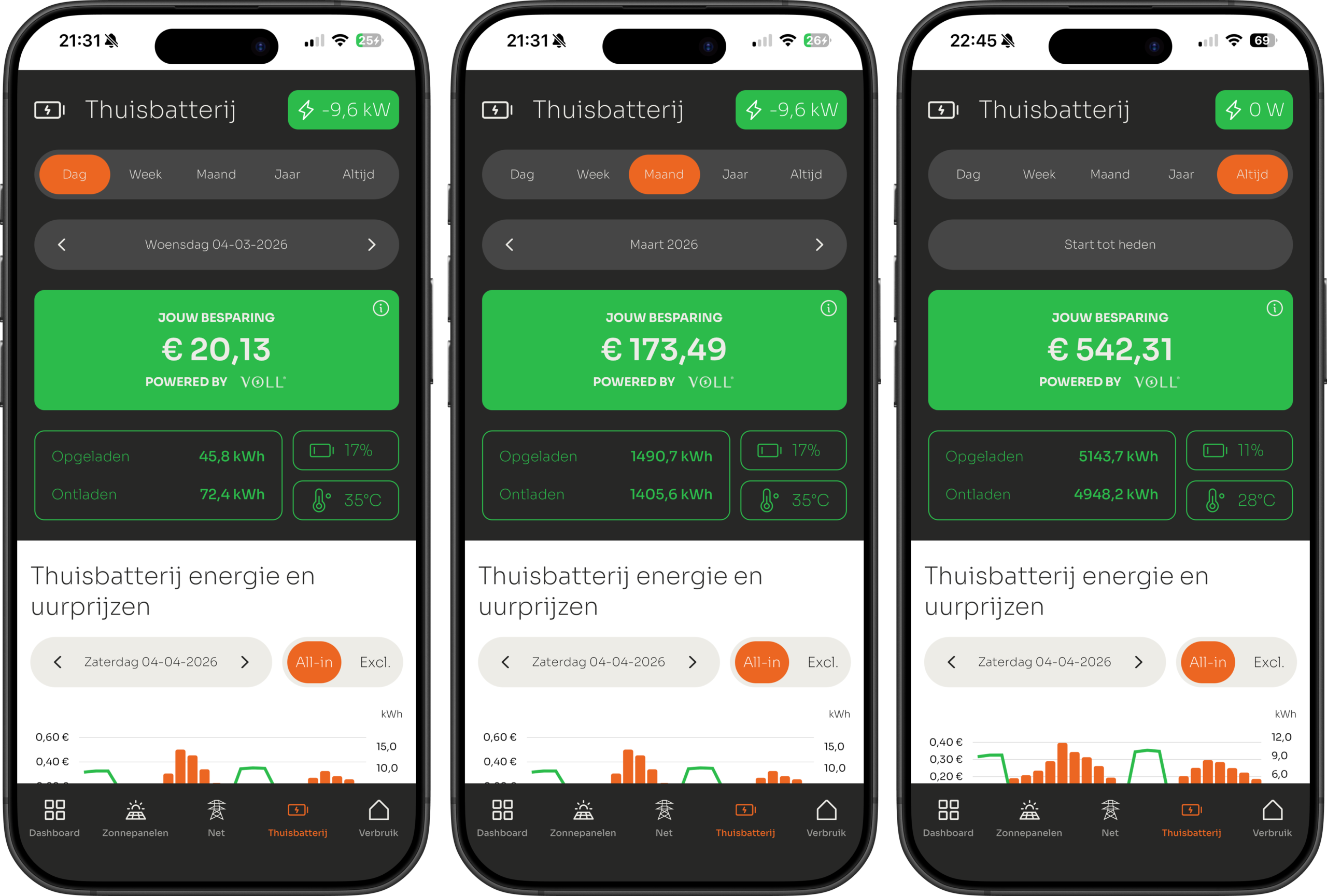 Je kunt de besparing die behaald is, en de hoeveelheid energie die is opgeladen of ontladen, met jouw thuisbatterij direct terugvinden. Dit is te monitoren per dag, per week, per maand, per jaar, en van start tot en met heden.