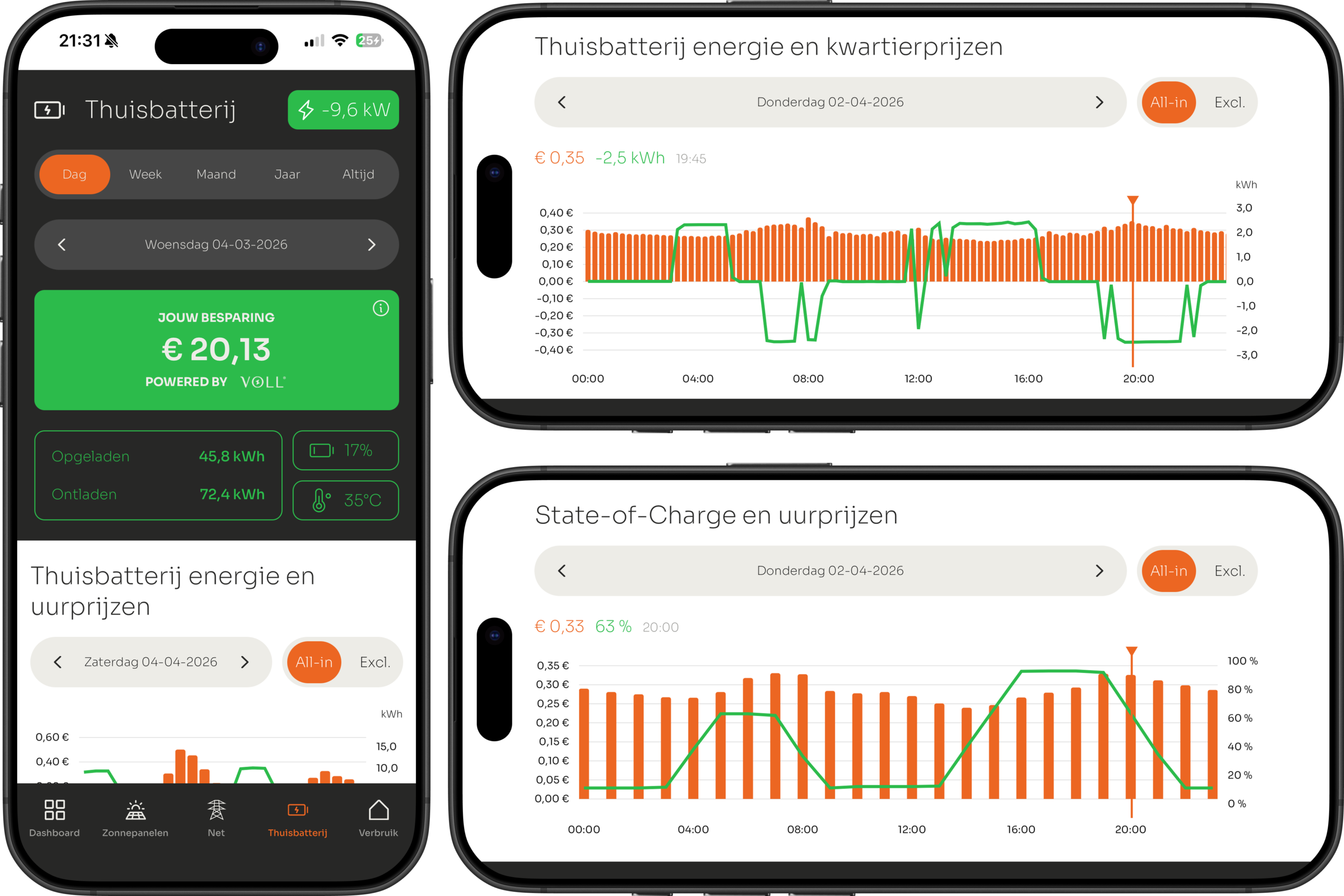 De State-of-Charge van de batterij op 20:00 was 63% en op 21:00 was dit nog maar 35%. Er is dus 28% aan batterij capaciteit ontladen in één uur. Dit heeft 9,7*€0,33 = €3,20 opgeleverd.