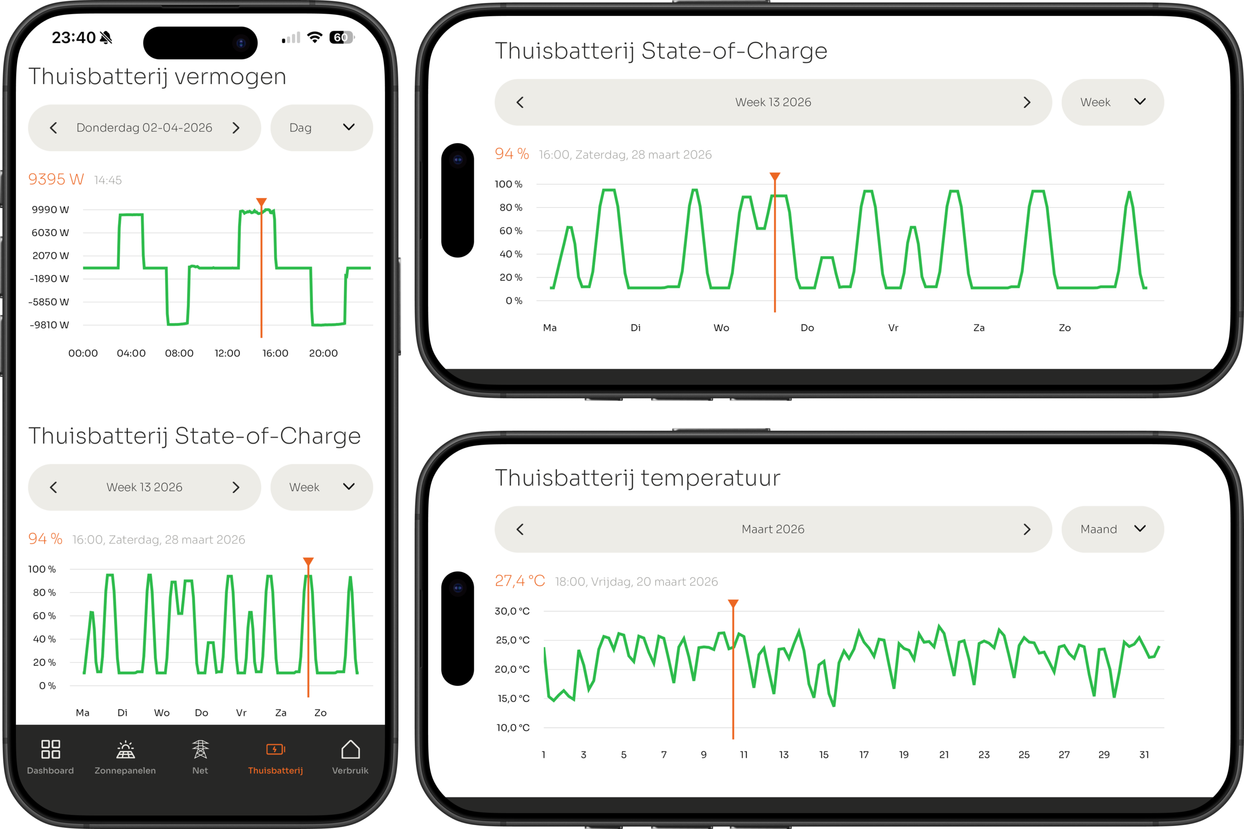 Thuisbatterij vermogen, State-of-Charge (%) en temperatuur