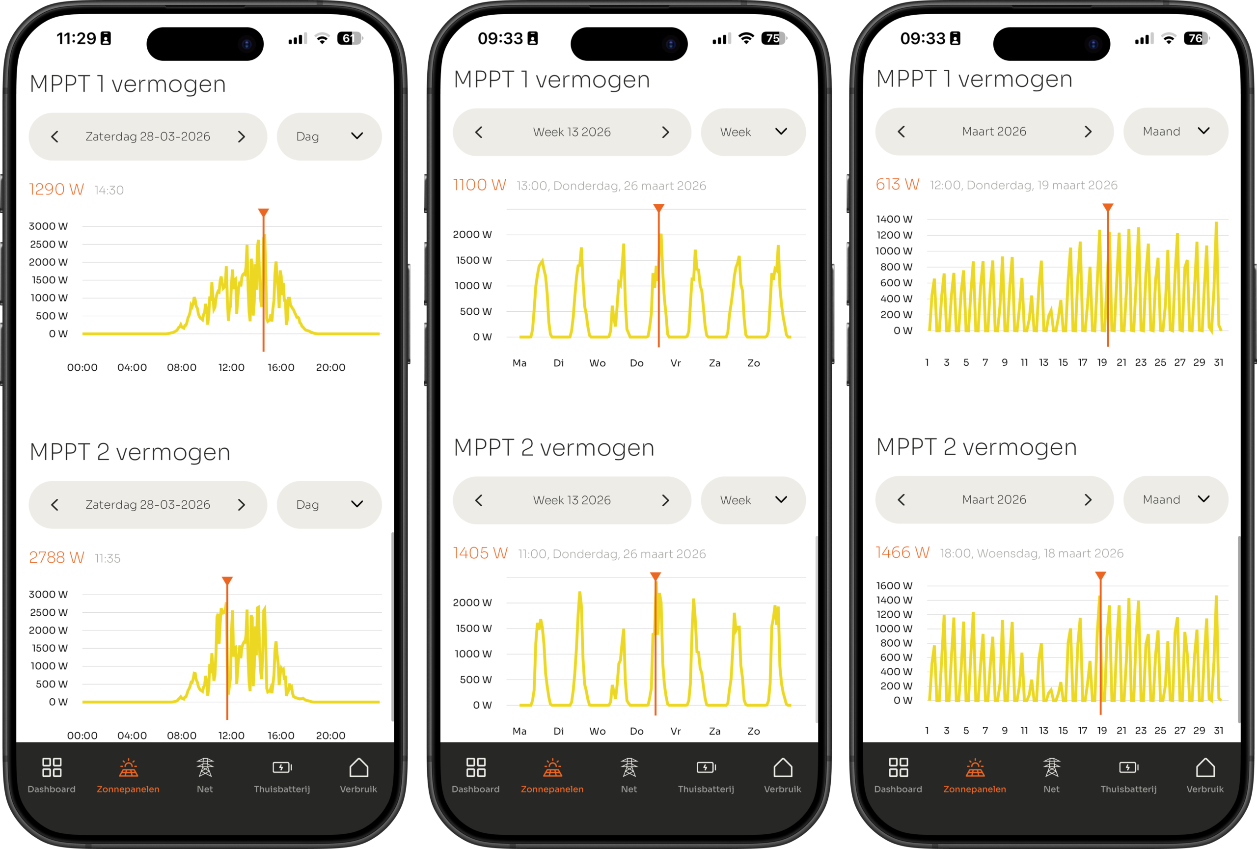 Per MPPT kunnen een verschillend aantal zonnepanelen aangesloten zijn en in de grafieken voor MPPT 1 & MPPT 2, kun je precies bijhouden wat de verschillende groepen zonnepanelen produceren.
