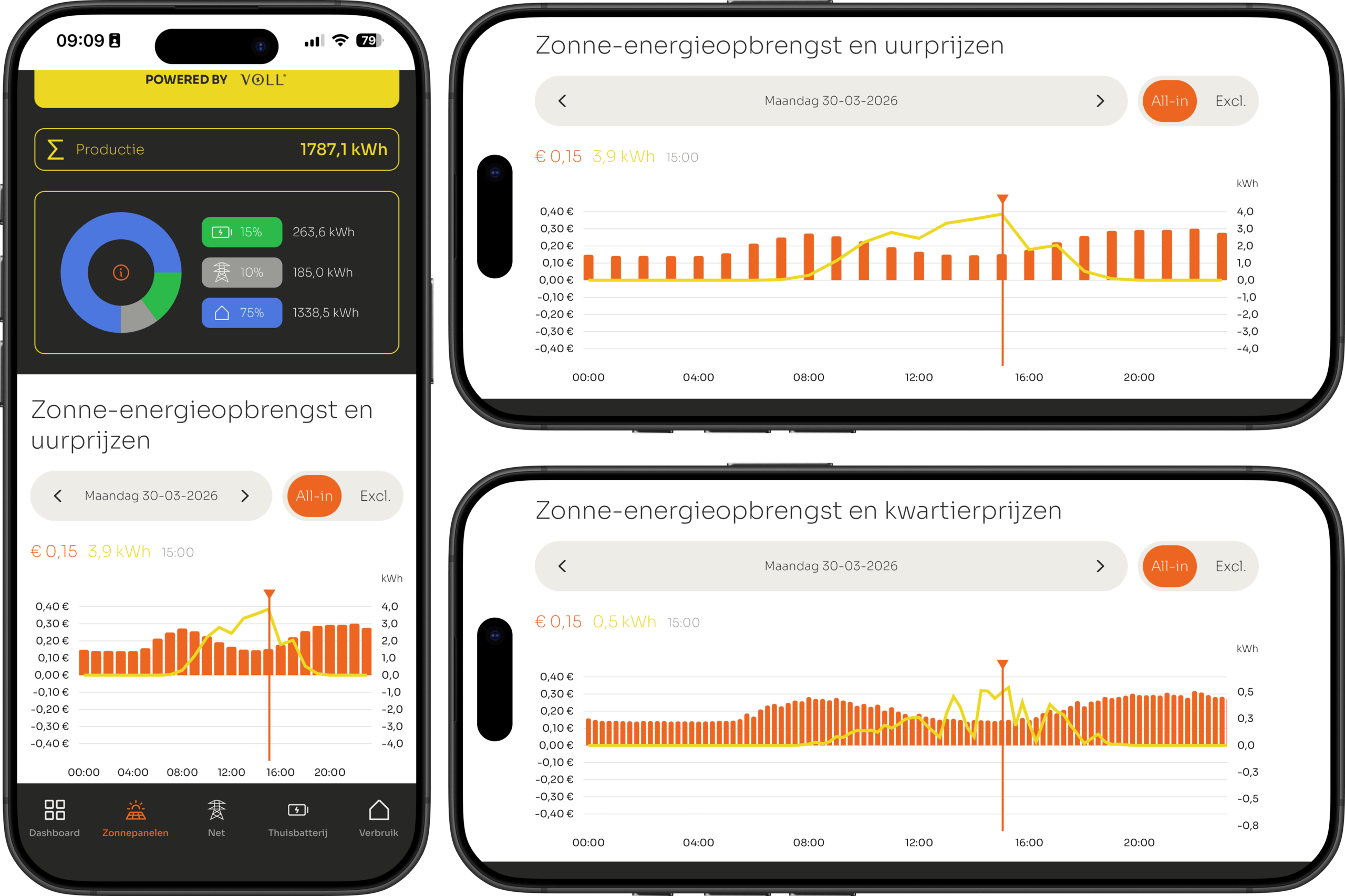 In de landscape modus, kun je ook zien wat de zonnepanelen hebben geproduceerd per kwartier en hier wordt dit ook vergeleken met de uur- of kwartierprijzen.