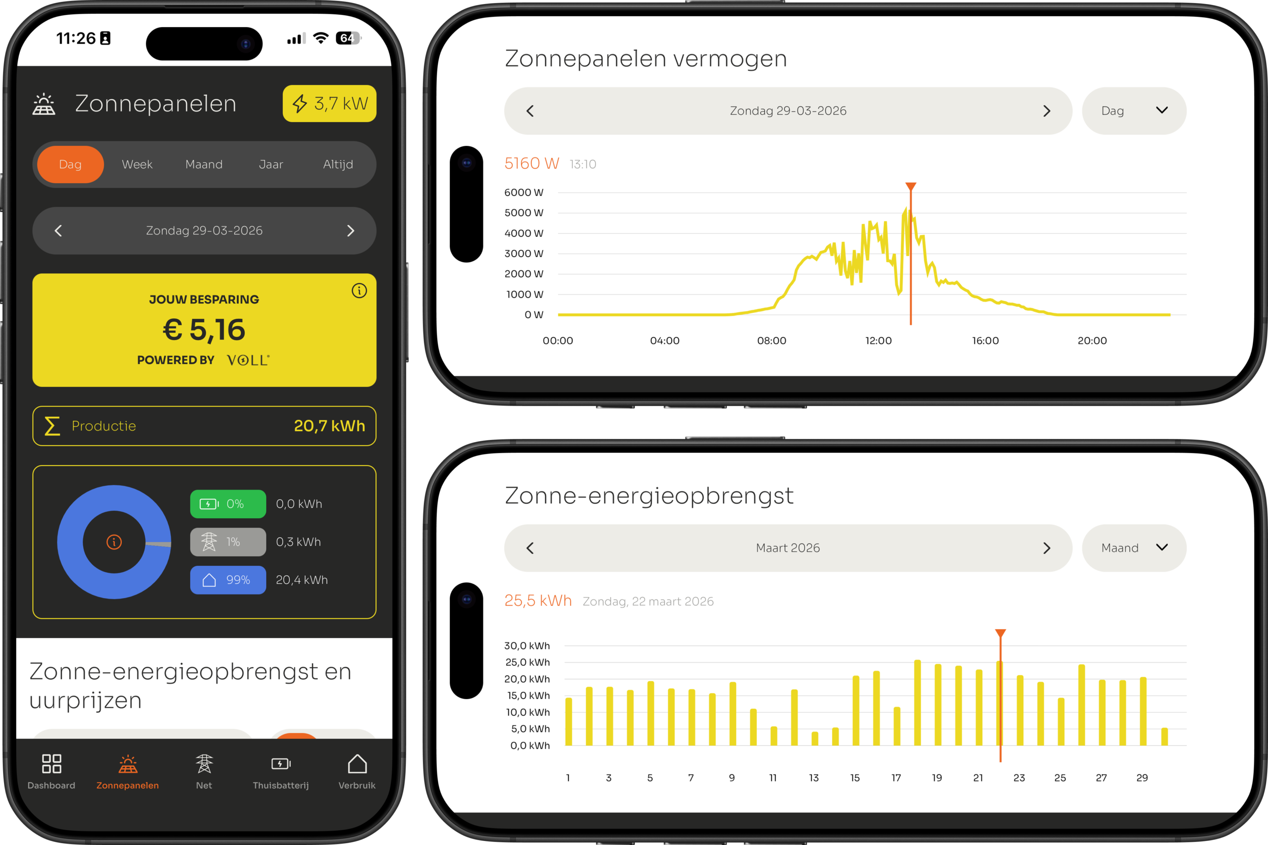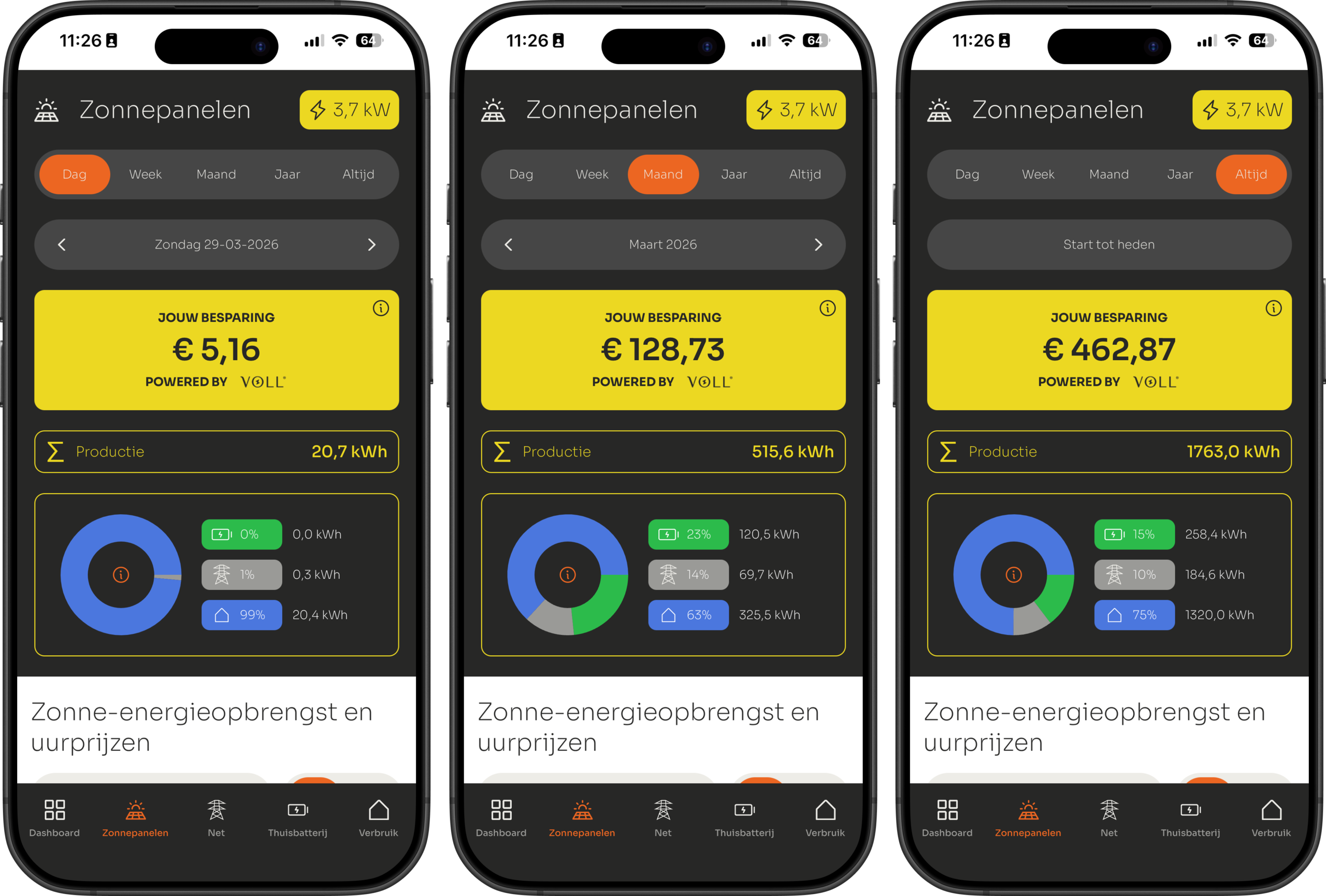 Je kunt de besparing en productie van jouw zonnepanelen per dag, week, maand, jaar en van start tot en met heden terugvinden.