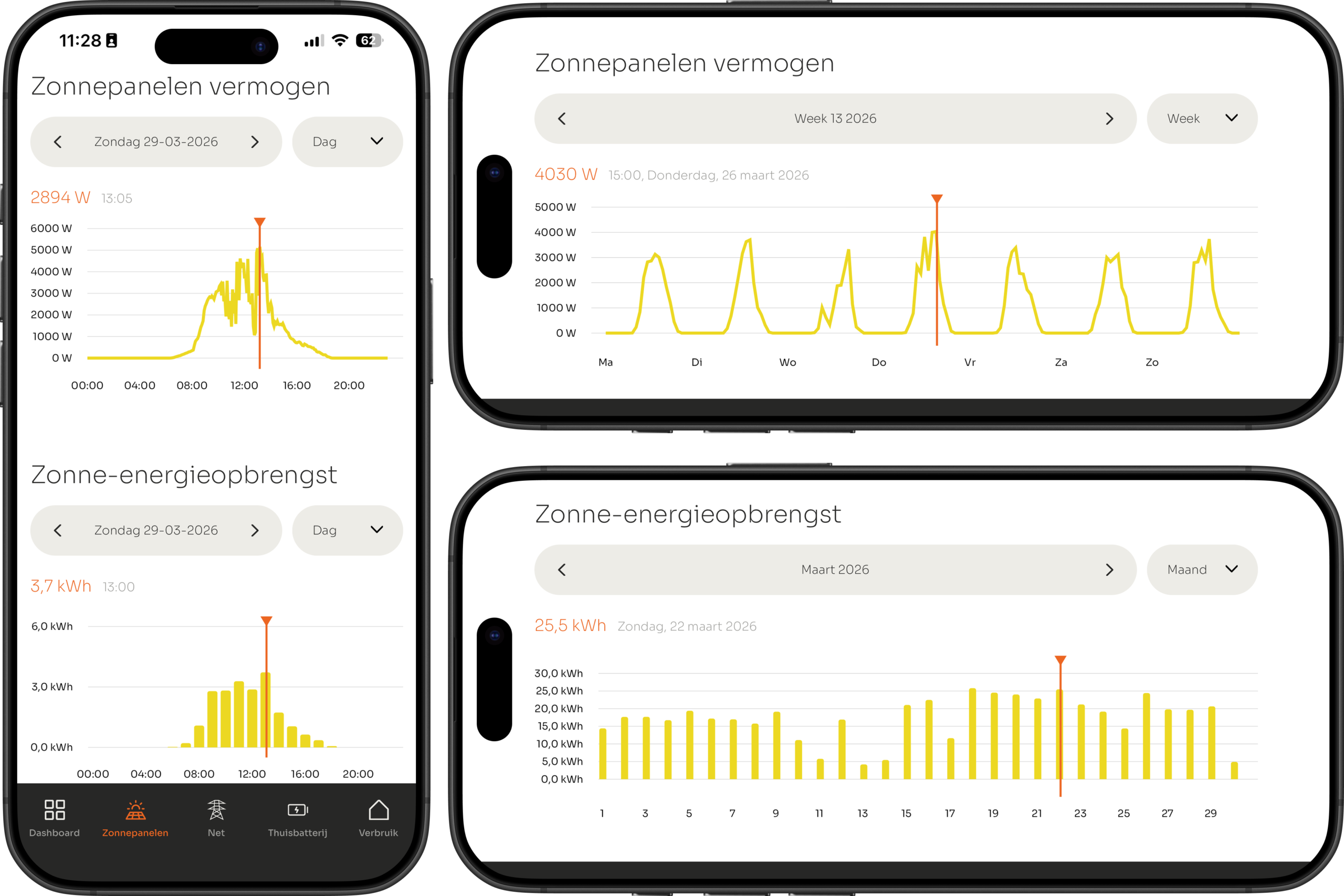 In de grafieken voor het vermogen en de opbrengst van de zonnepanelen, vind je alle aangesloten zonnepanelen op de hybride omvormer terug. Hierin zitten de direct aangesloten zonnepanelen, maar ook de gekoppelde omvormers met zonnepanelen, zoals bijvoorbeeld Enphase micro-omvormers, SolarEdge of Huawei omvormers met optimizers, of andere gekoppelde string omvormers.